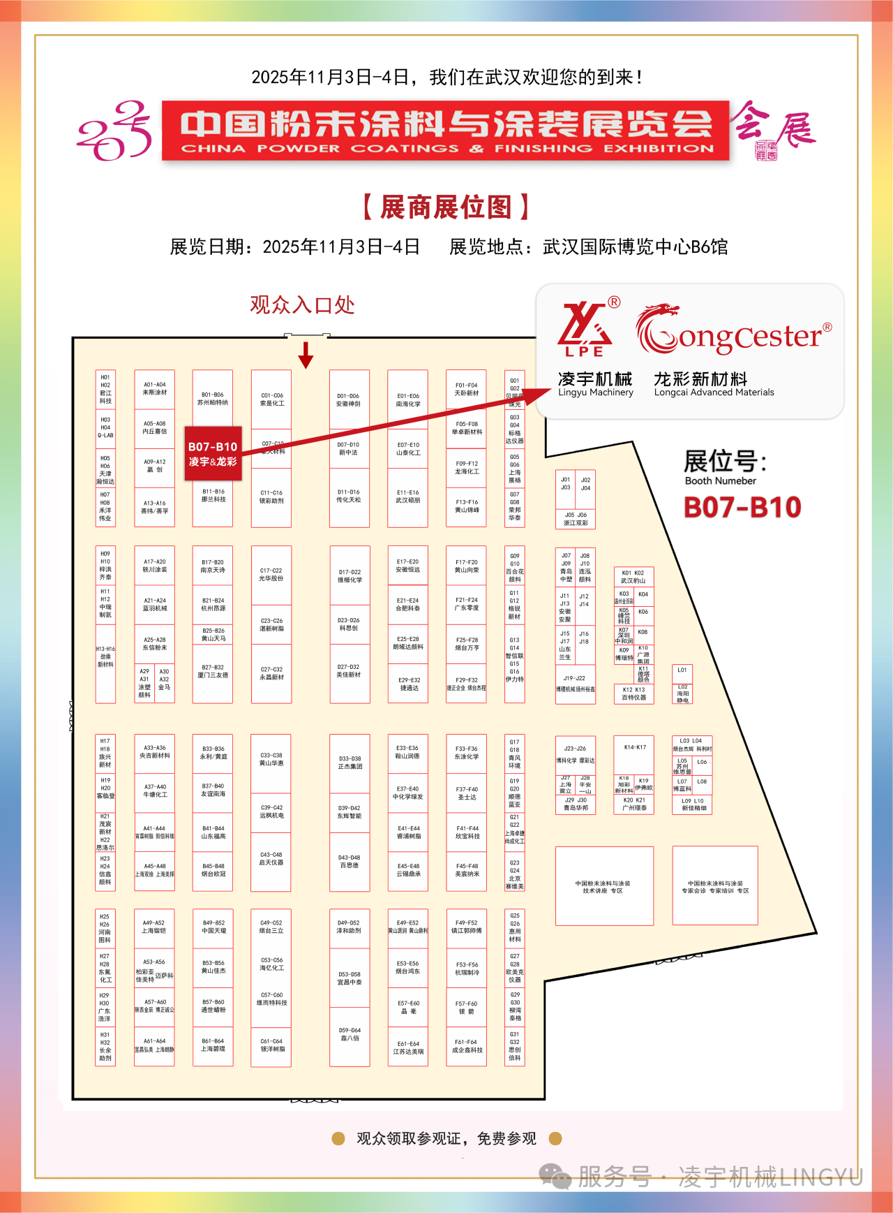 作为粉末涂料加工设备与原材料领域的代表性企业,凌宇机械与龙彩新材料将联袂参加此次会议,在B6 馆 B07-B10展位为您呈现 “设备 + 材料” 协同创新的解决方案,诚邀您莅临展位,共同探讨技术突破新路径,锚定行业发展新方向。
